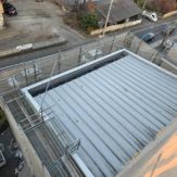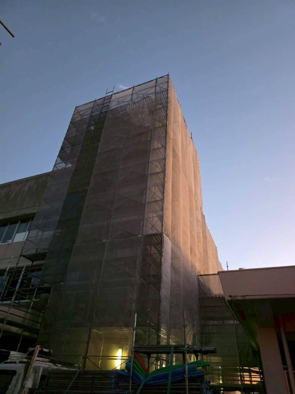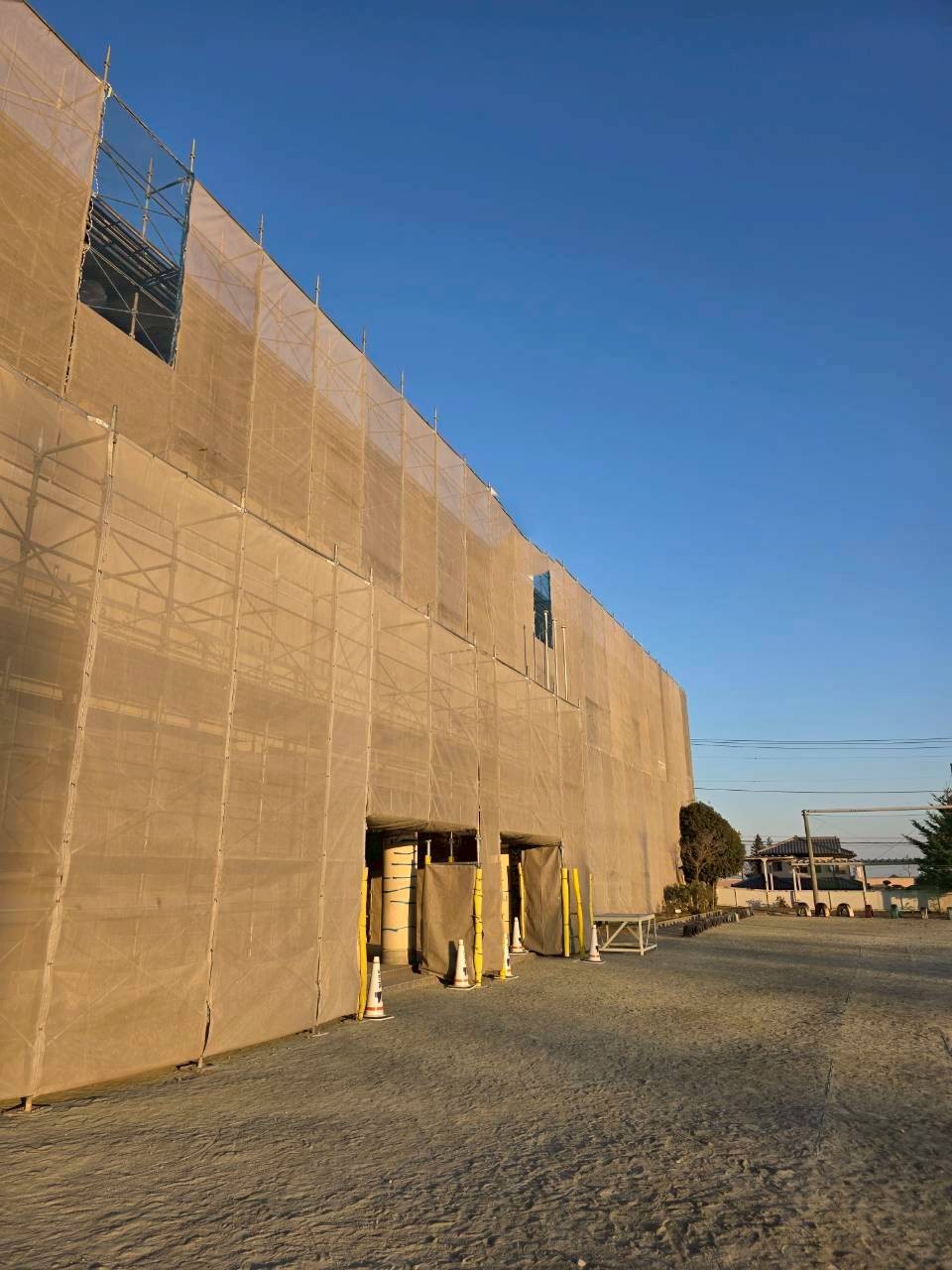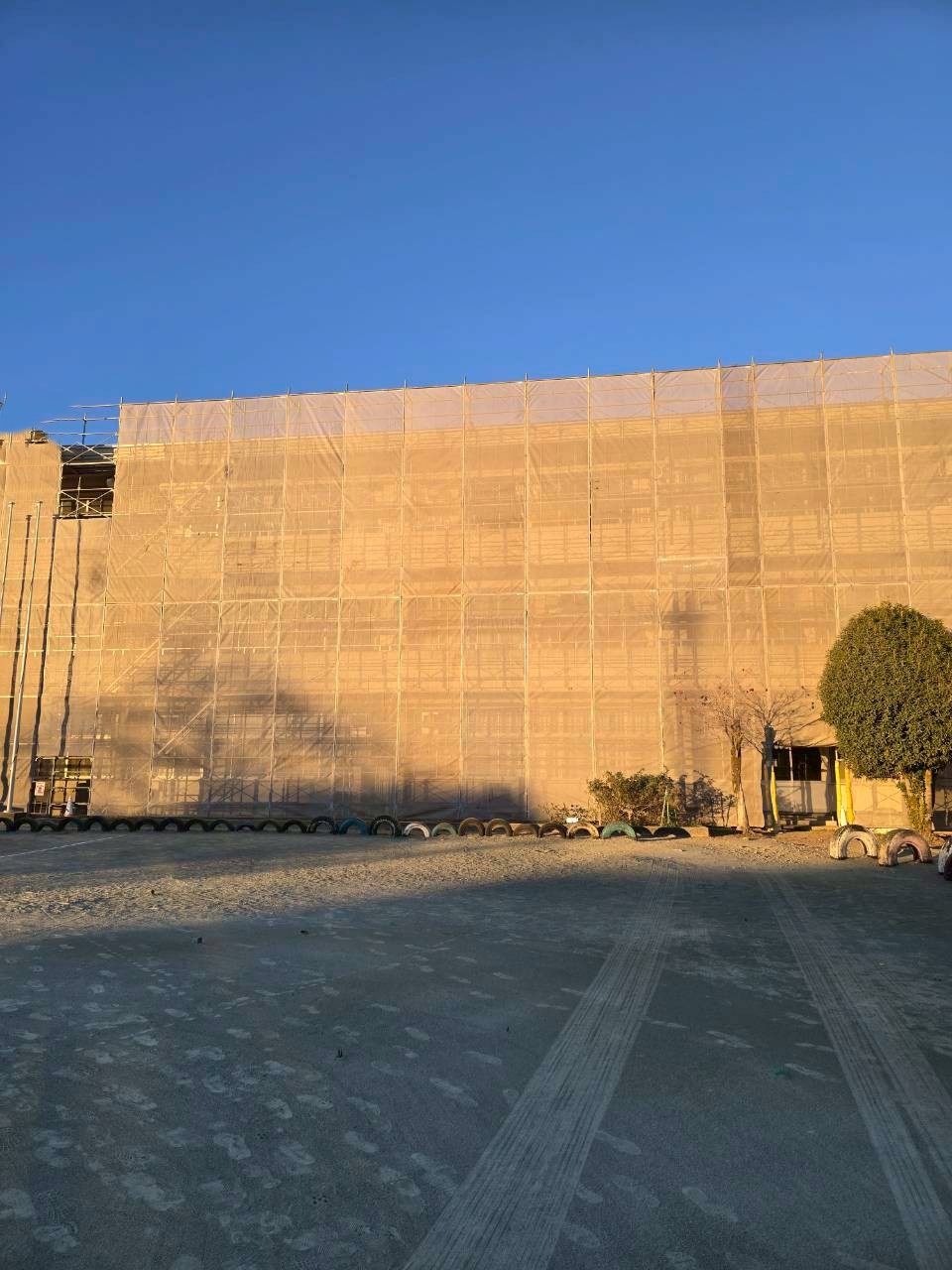 クサビ緊結式足場手すり先行工法での施工です。開校中の施工なので第三者(児童)の安全配慮が非常に重要な工事でした。