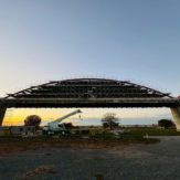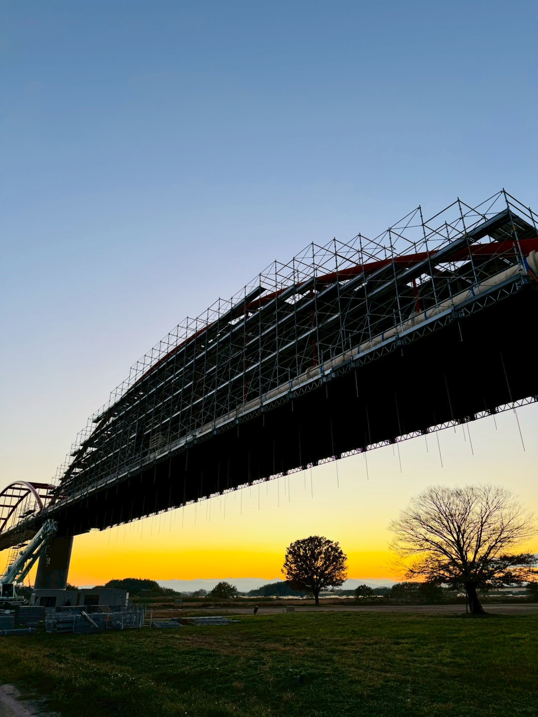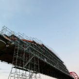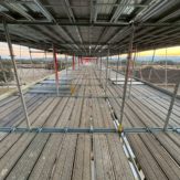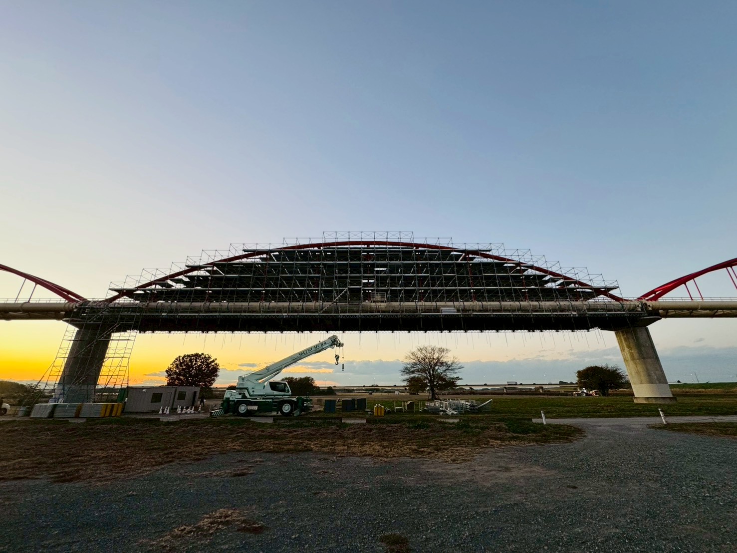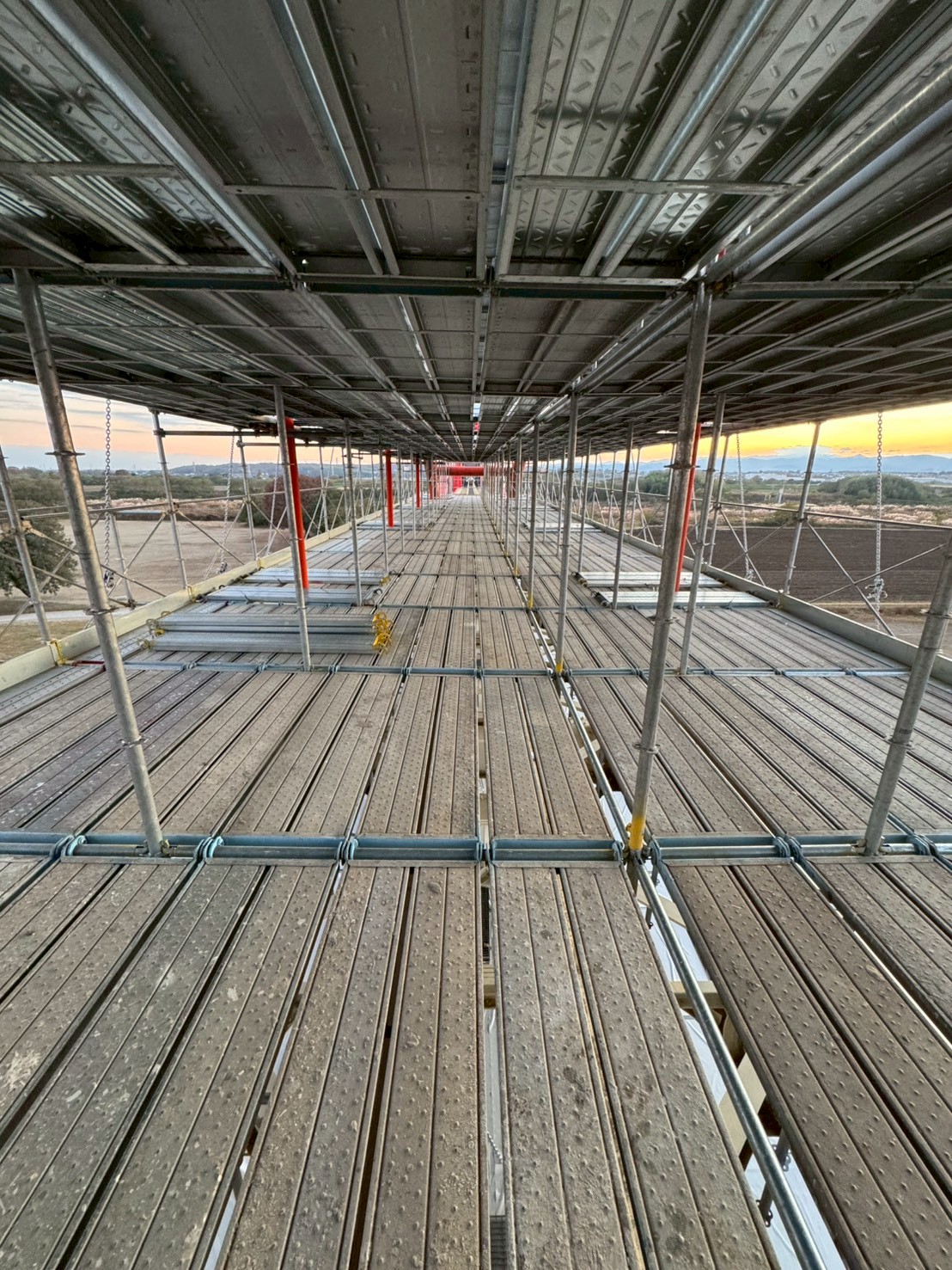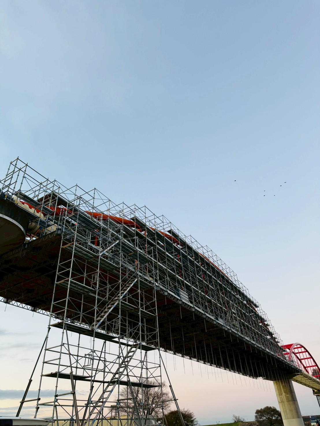 埼玉県内の水管橋塗替え塗装工事用の足場です。 アーチ部分の塗装塗替え工事がメインの工事になりますので吊り棚足場上に地組の足場が必要になります。弊社では安全性、強度を考慮してクイックデッキをチョイスして地組足場は広い作業空間による作業性、安全性に優れた次世代型足場を採用させて頂きました。