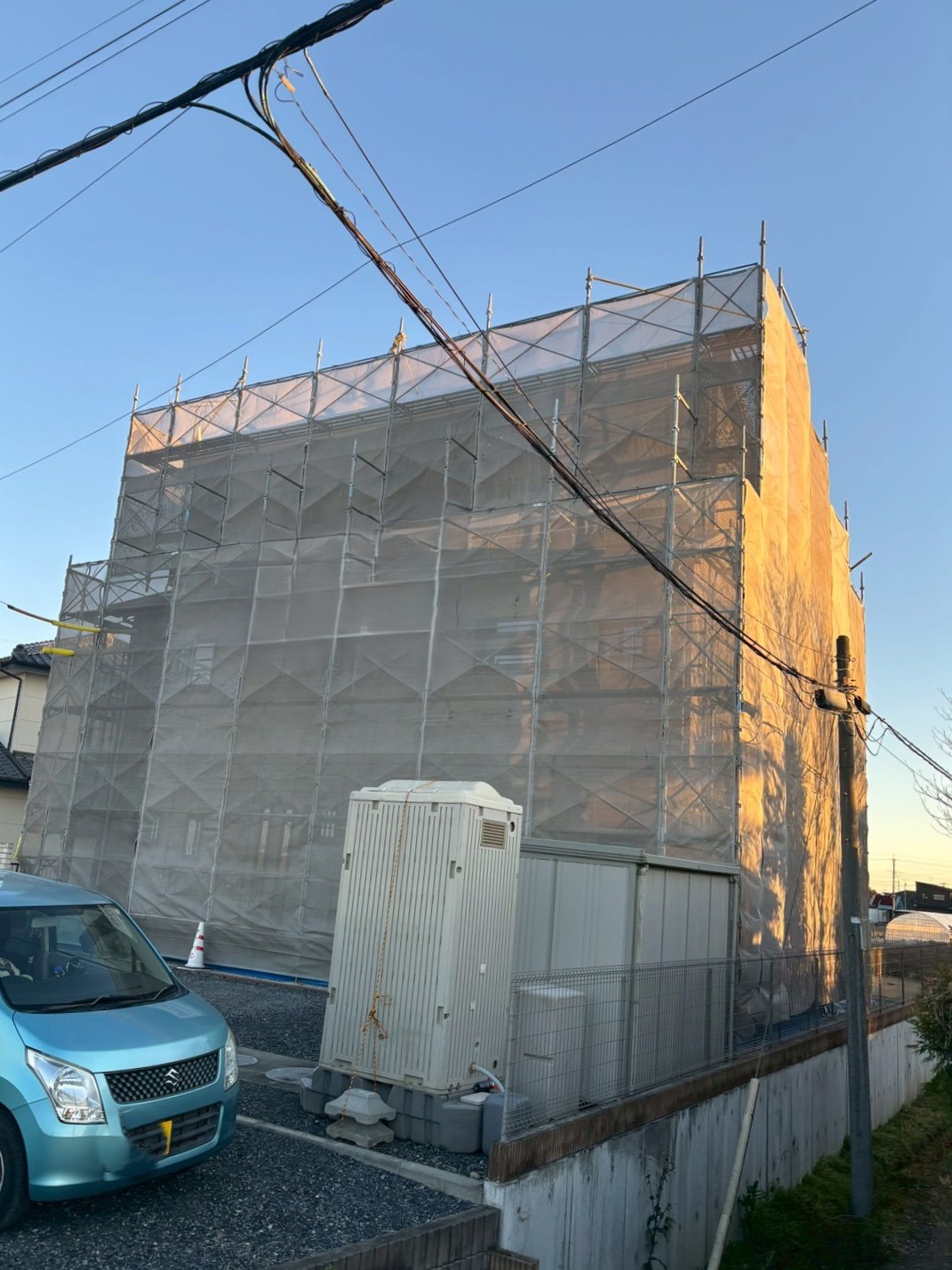 群馬県内の一般住宅改修工事です。 2面が狭小地の為、作業性を考慮して一側足場で対応させて頂きました。